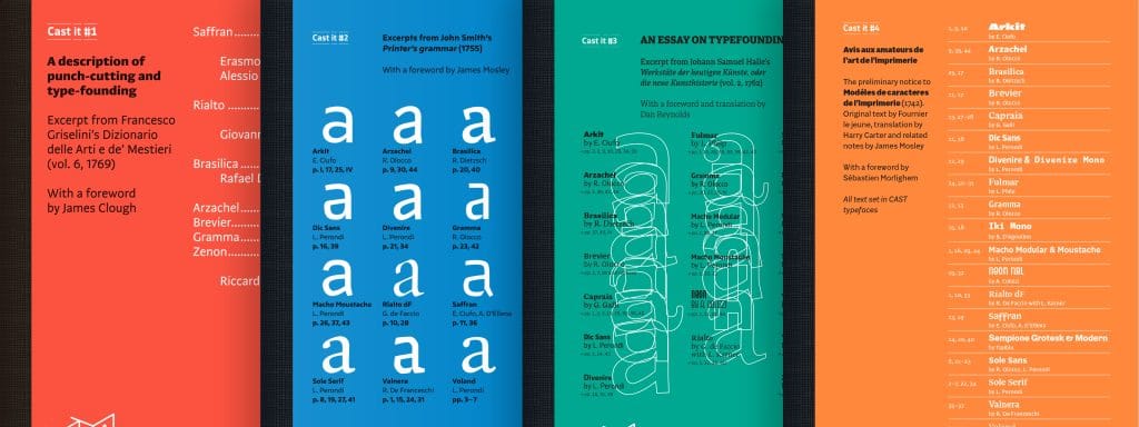 Cast it is a periodical displaying CAST typefaces making use of texts from the history of typography as specimens. It is a series of 48-page booklets prefaced by an expert on the subject and co-produced with the independent Italian publisher Lazy Dog Press.