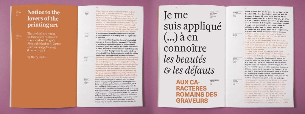 RO – We started the series with an Italian text, followed by an English text and then a German one. This time we decided to opt for a French text, so I asked Sébastien Morlighem to take part in the new issue. I’ve been in touch with Sébastien since we first met in Reading almost ten years ago and we often meet at events such as international conferences. When he suggested the choice of Fournier’s ‘Avis aux amateurs de l’art de l’imprimerie’ as a subject, I agreed immediately. Then, besides the original text in French (4,000 words), we included Harry Carter’s English translation as published in Mosley’s facsimile of Fournier’s Manual (the Darmstadt edition), including James’s notes on Carter’s translation (5,200 words altogether).