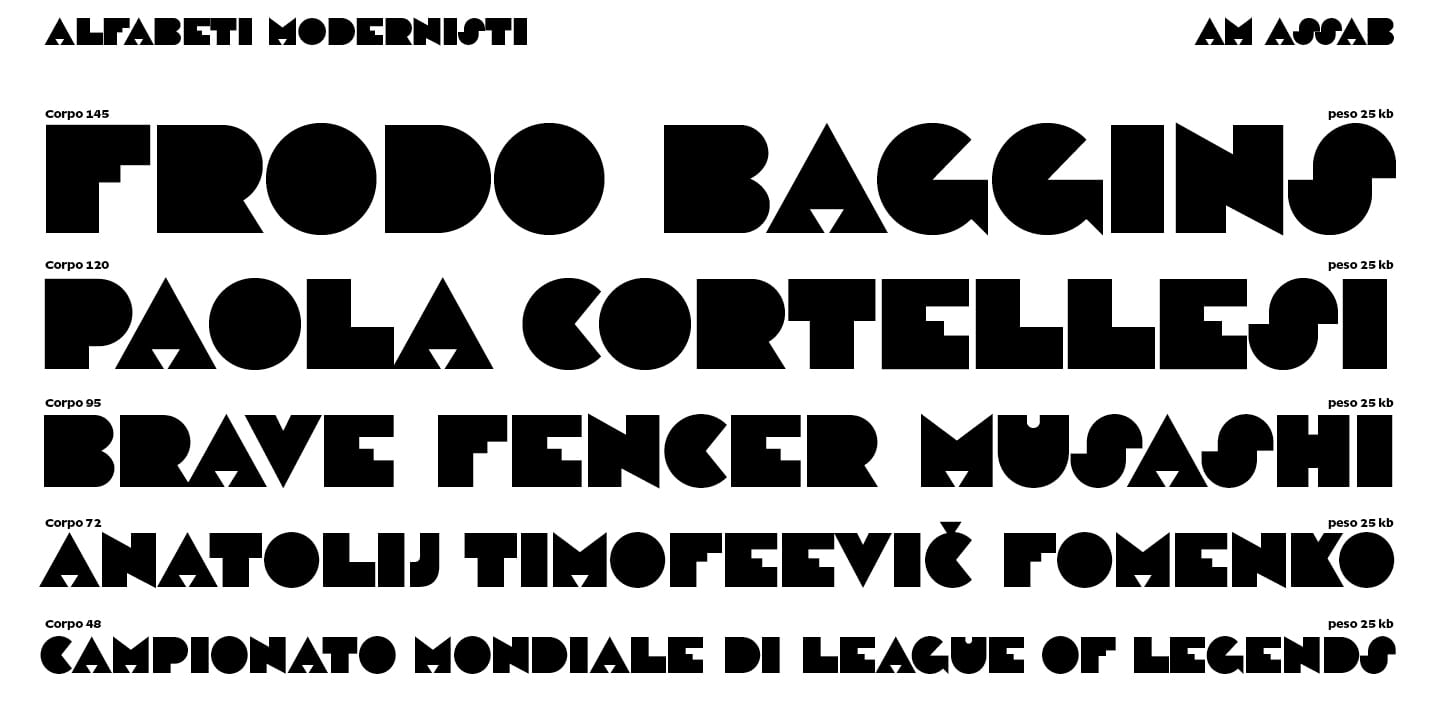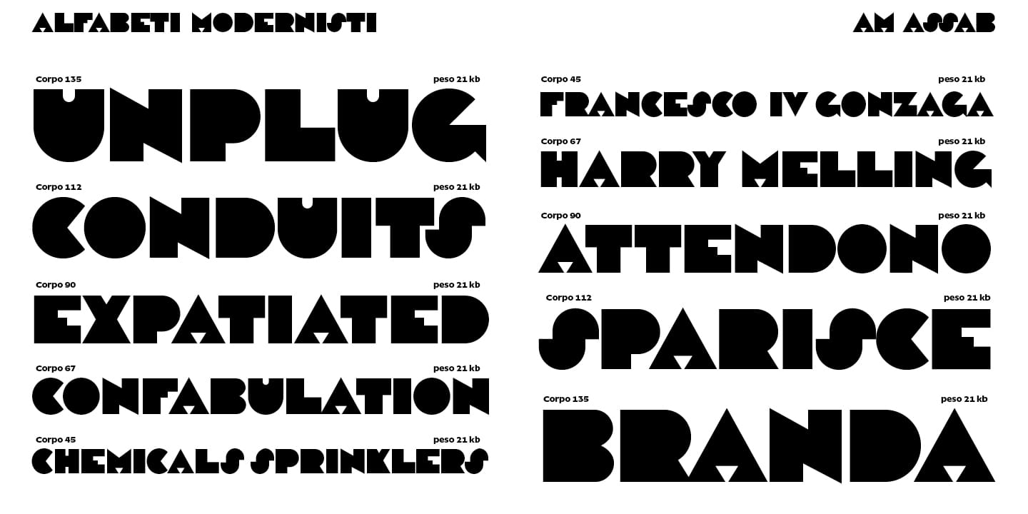 Assab interpreted the counterless sanserifs of the 1930s, a style of lettering popular in Italy in the growing field of advertising. It was a powerful expression of both Modernism and the Fascist regime, which used cutting-edge graphics of the time as corporate design. This kind of letterforms were incorporated into Fortunato Depero’s special variations of sanserifs and used in all kinds of graphic works. Baby Teeth, designed by Milton Glaser in 1964 for his famous Dylan record cover, can be considered the most famous heir of Assab and the counterless sans of the 1930s.