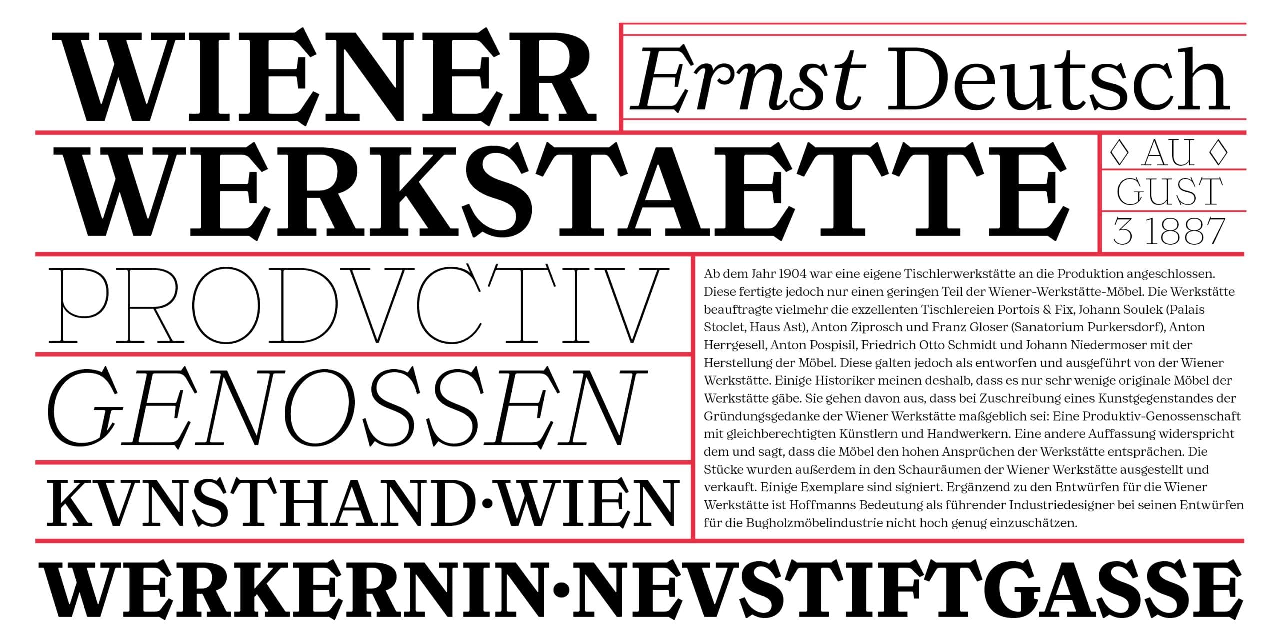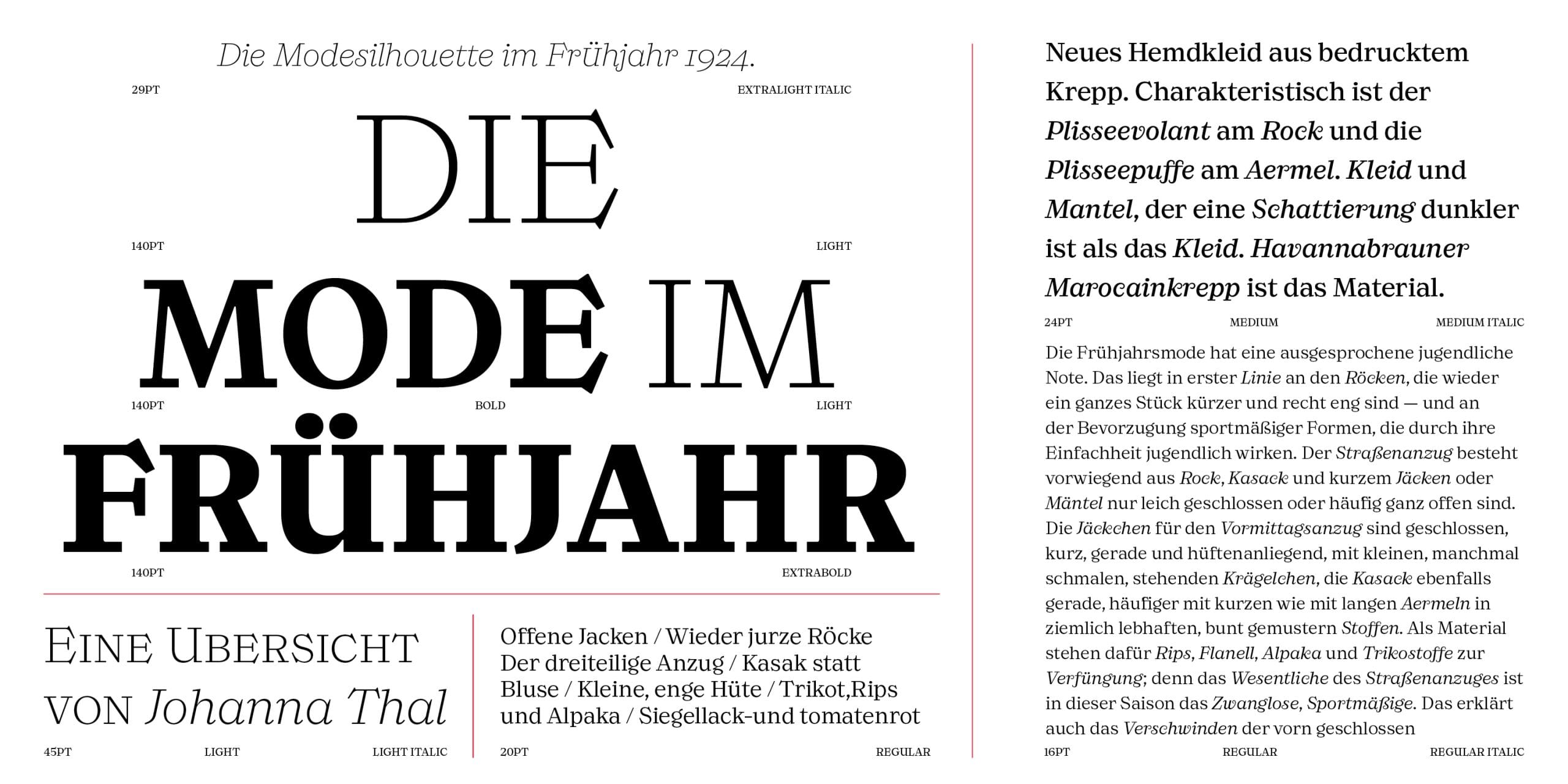 Ernst is an elegant but playful slab serif which harks back to some peculiar early 20th-century types but responds to contemporary demands by offering a wide range of applications. Not properly a revival, Ernst blends type details from avant-garde faces such as Ernst Deutsch/Dryden’s Tango and Georg Belwe’s Belwe Antiqua. Its pronounced and frisky details make it a strong candidate for display work, while the big x-height, its design rigour and consistency of proportions also make it suitable for long texts.