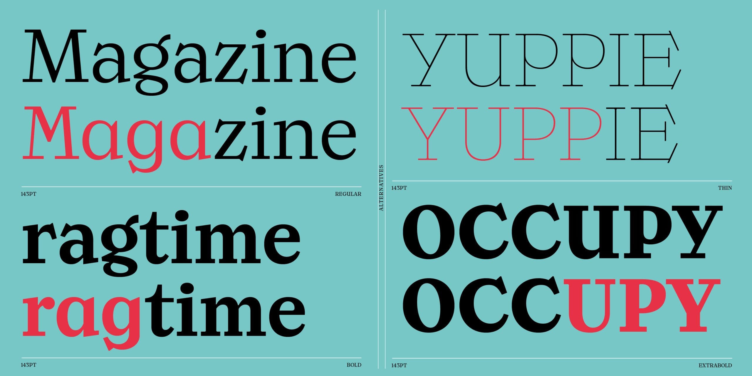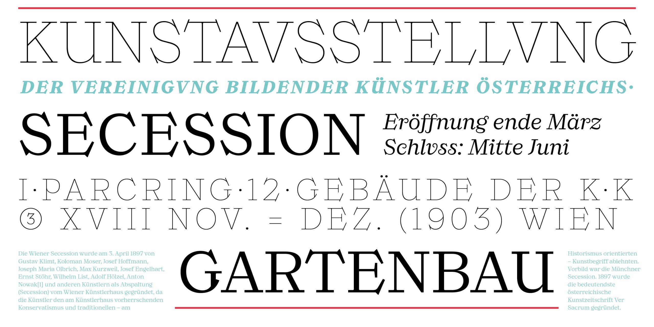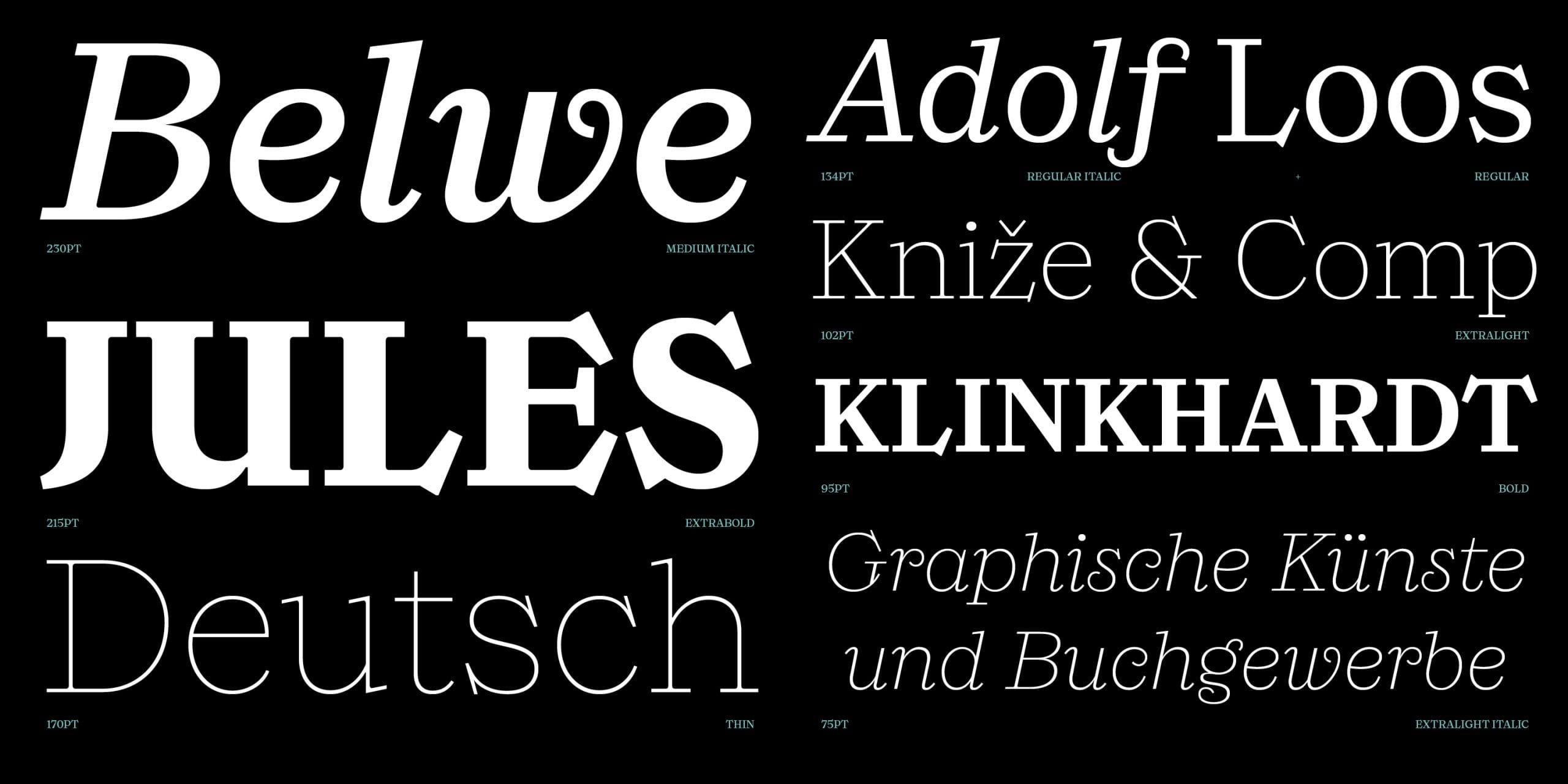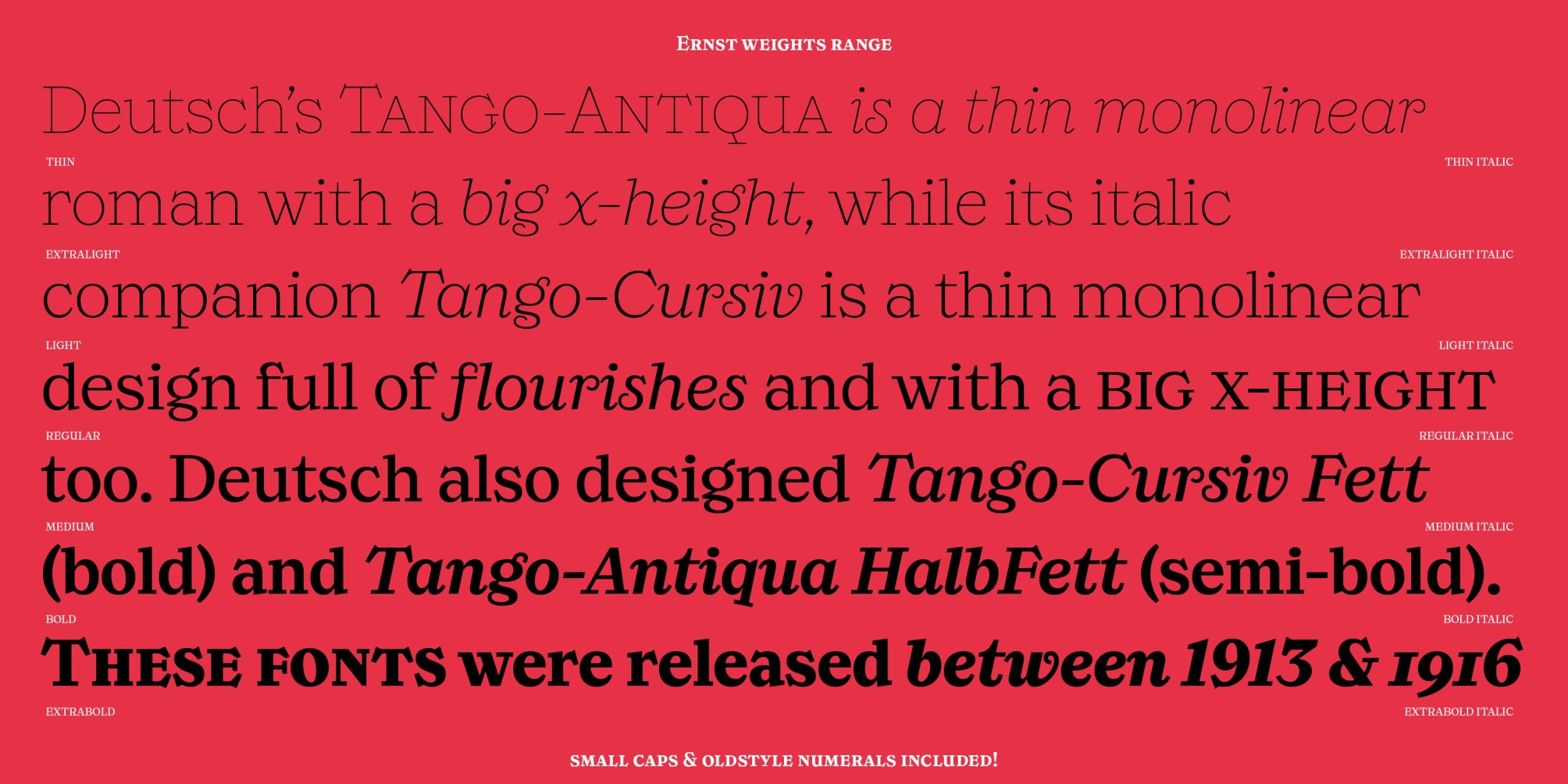 Ernst and its italic come in a range of seven weights, from Thin to ExtraBold, and feature old style figures, small caps and some alternate letters.
