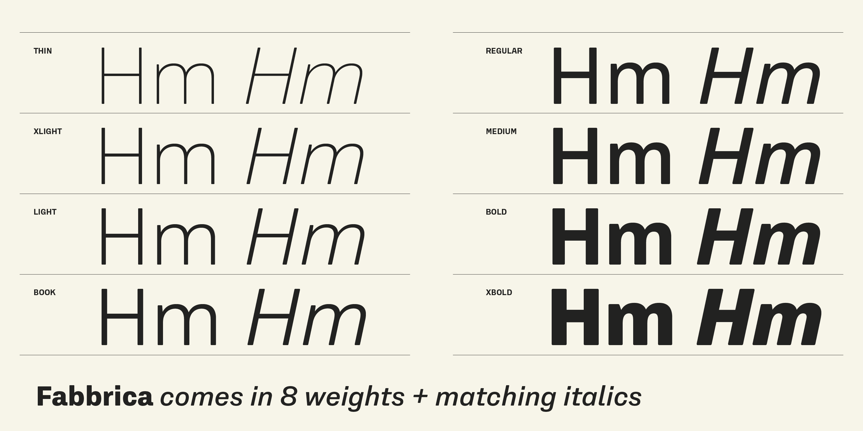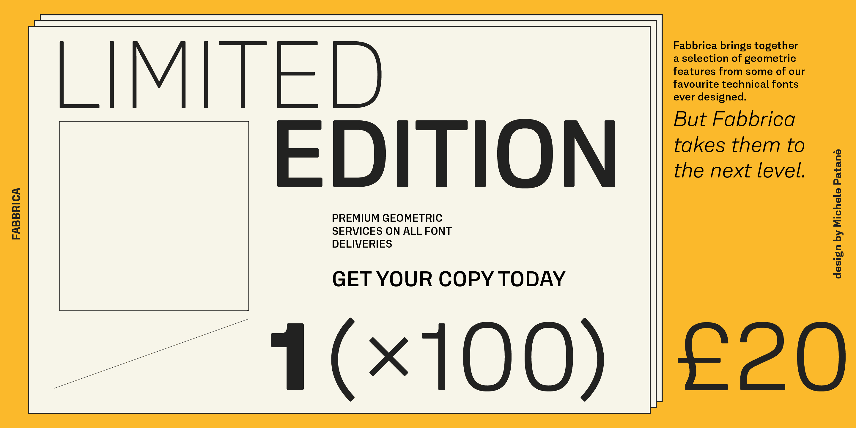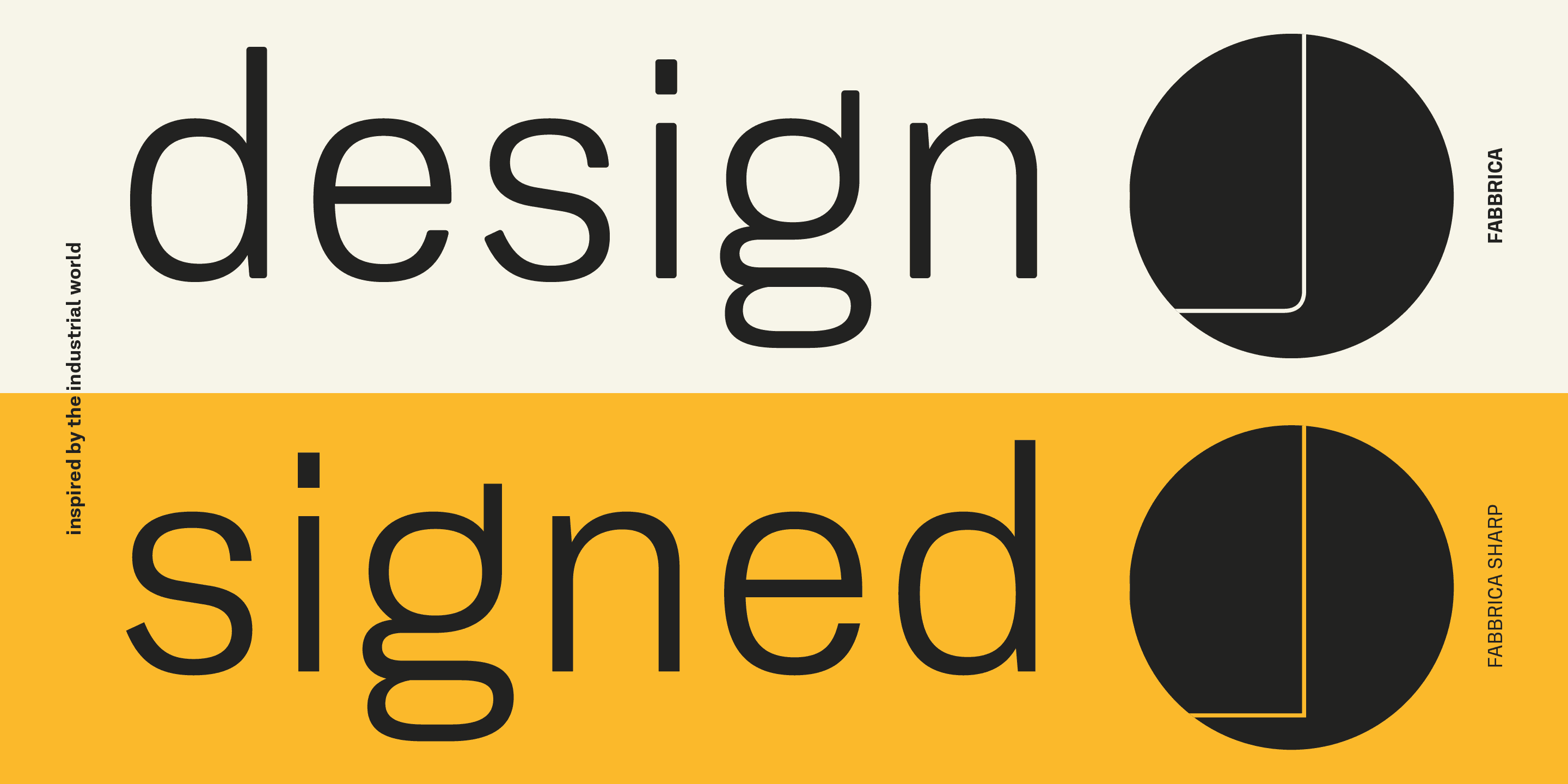 Fabbrica (the Italian word for ‘factory’) is a distinctive sanserif typeface inspired by the world of industrial production and designed for branding, publishing and advertising as well as technical publications.