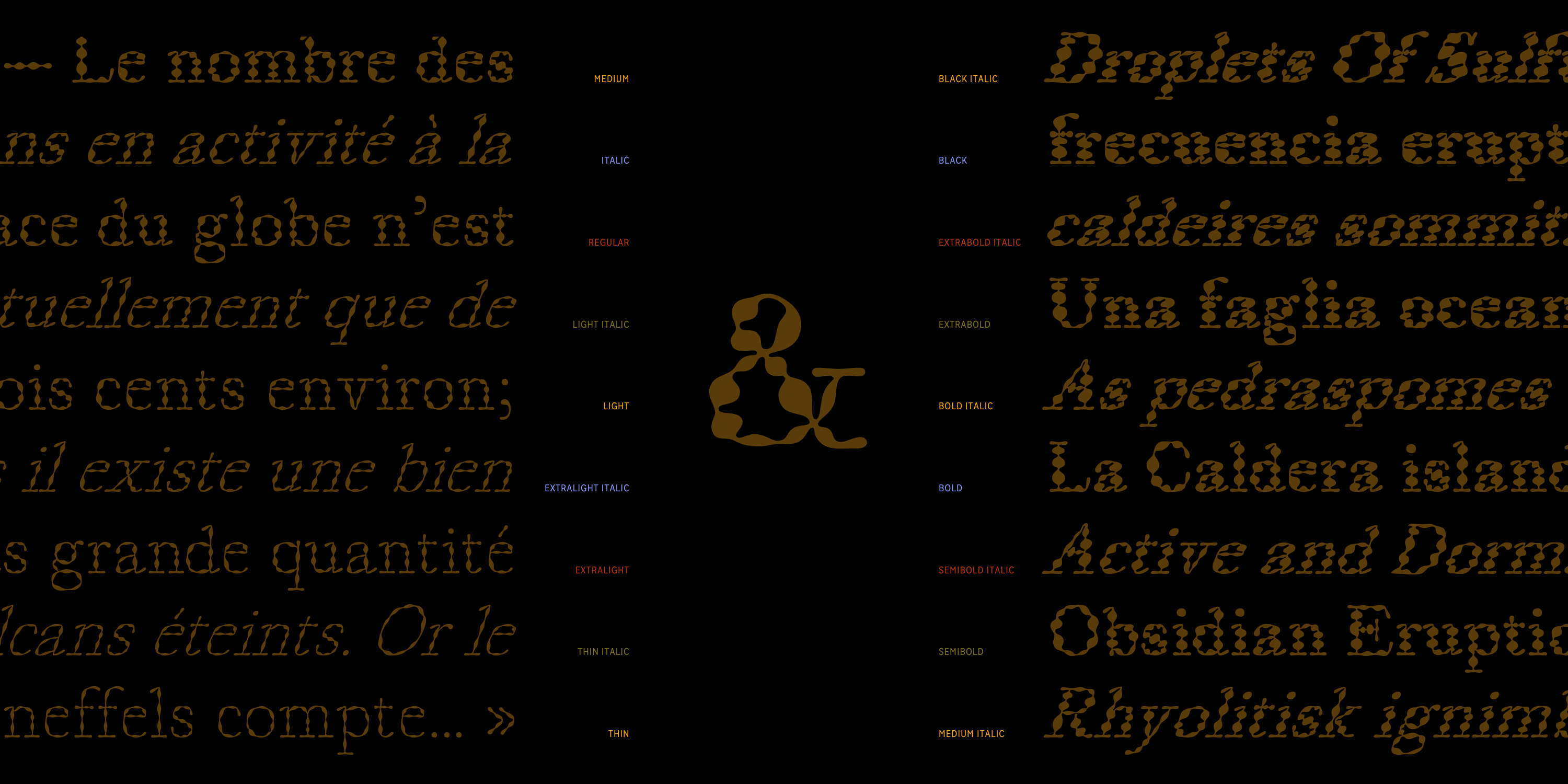 Magmo is a contemporary serif face with fluid and unusually irregular shapes. With its nine weights and their slanted versions, it works well for expressive headlines. But thanks to their classic proportions and details, the lighter weights are also effective for certain texts in small sizes.