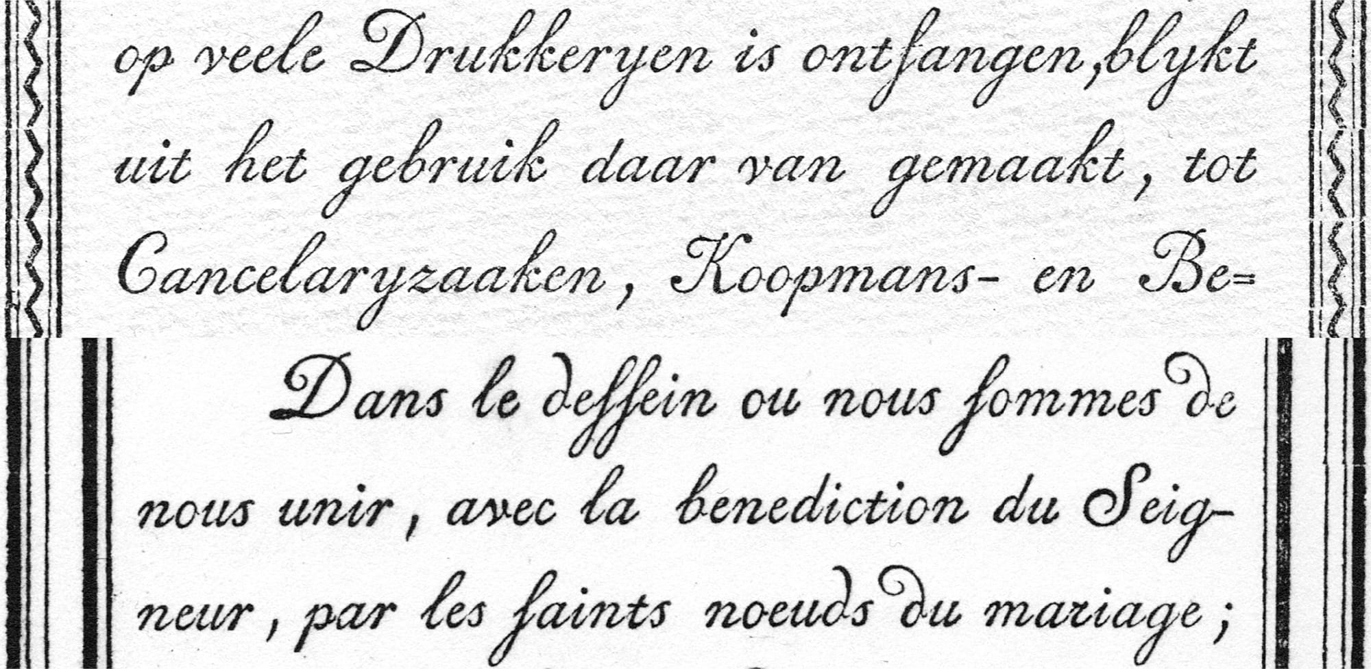 Other models of Caractère de Finance that were taken into account by Casali. From left to right: Dubbelde Mediaan Geschreven (J-F. Rosart, 1753), Dubbelde Garmond Geschreven Schrift (Fleischman, 1768), and Dubbelde Augustyn Geschreven (M. Rosart, 1773). All from Proef Van Letteren, Enschedé type specimen, 1768 and 1773.