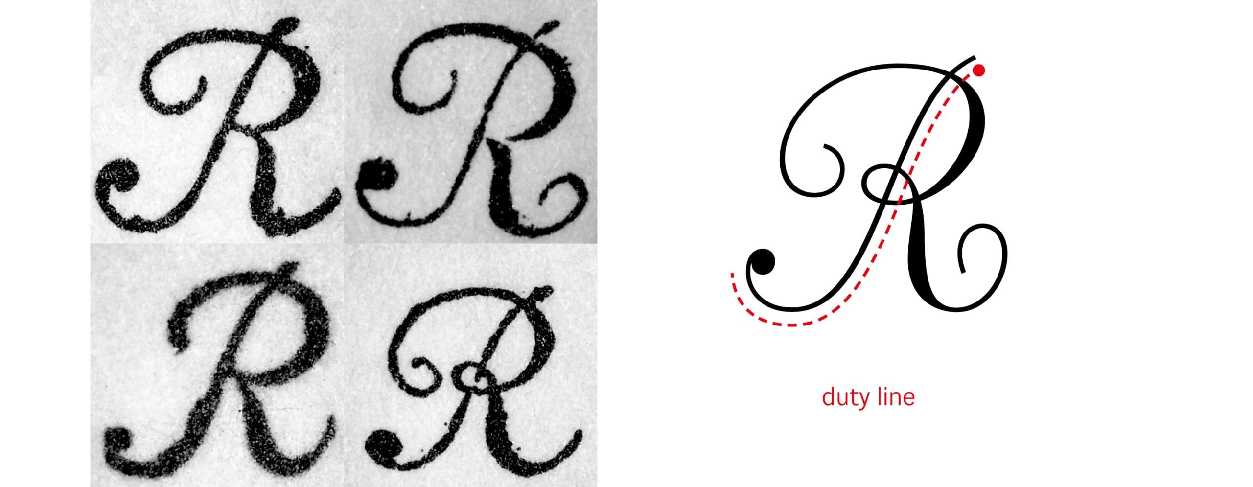 Samples of Fleischman’s and Rosart’s types showing capitals R with the characteristic thin ‘duty line’.