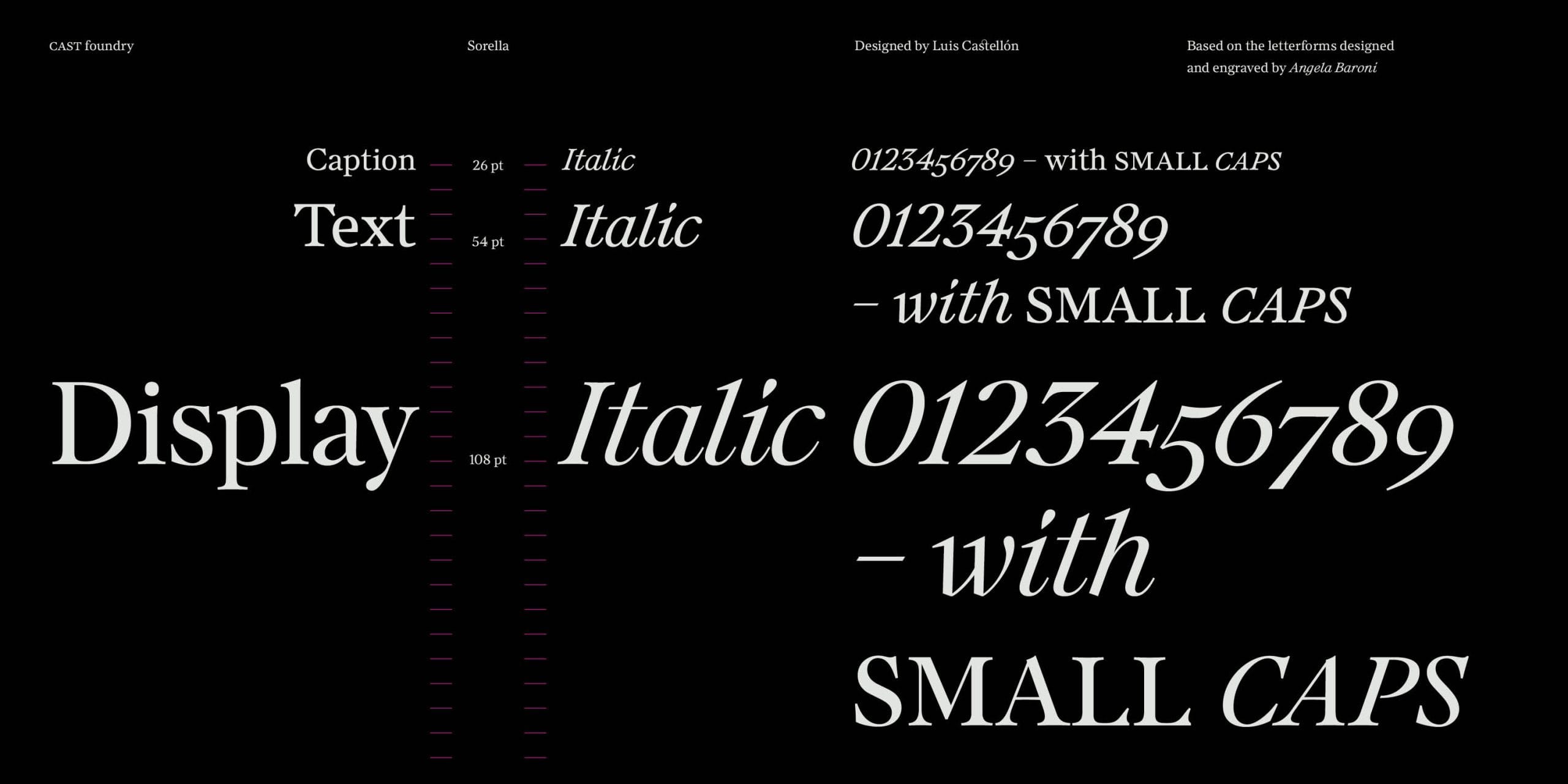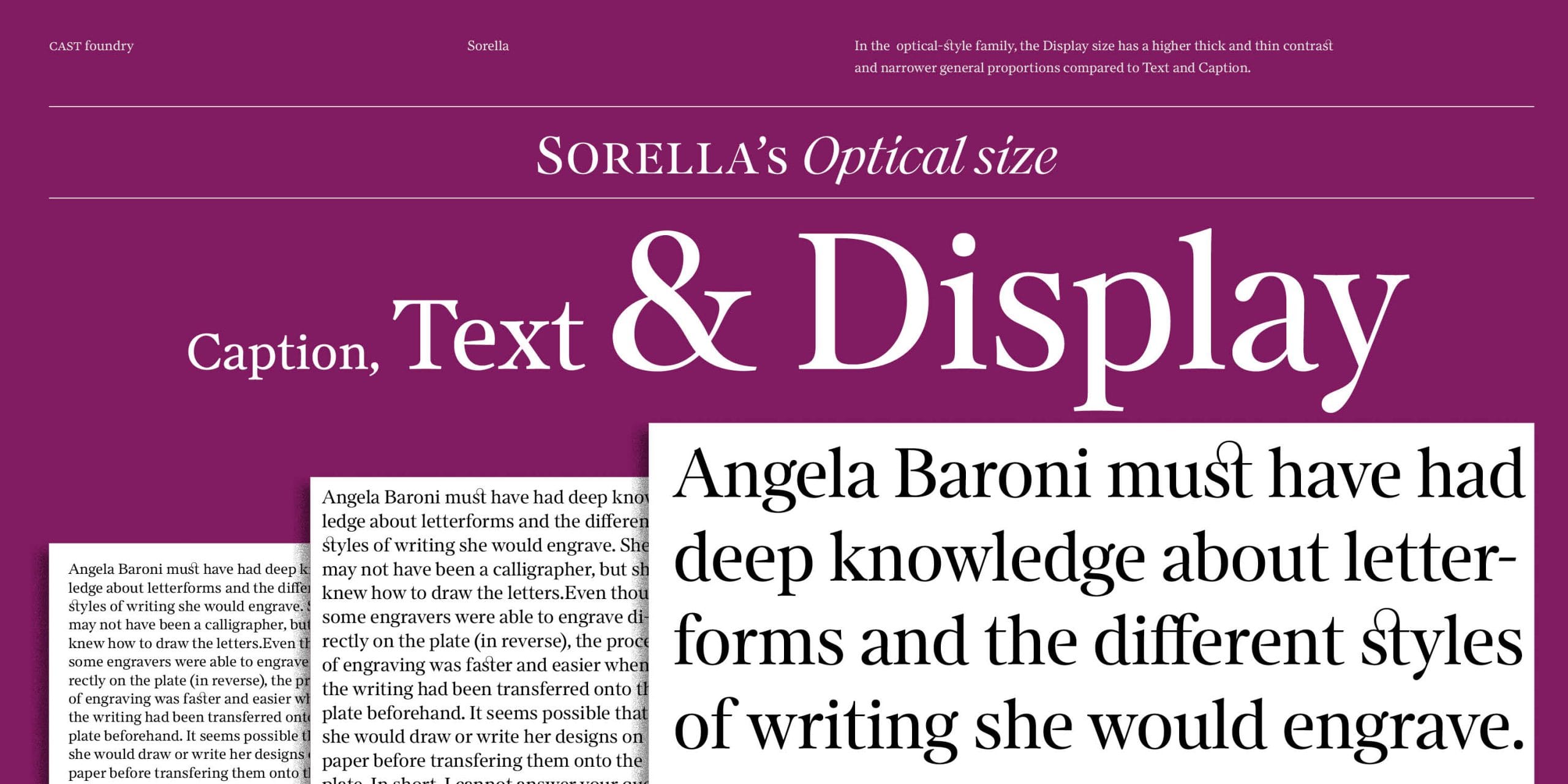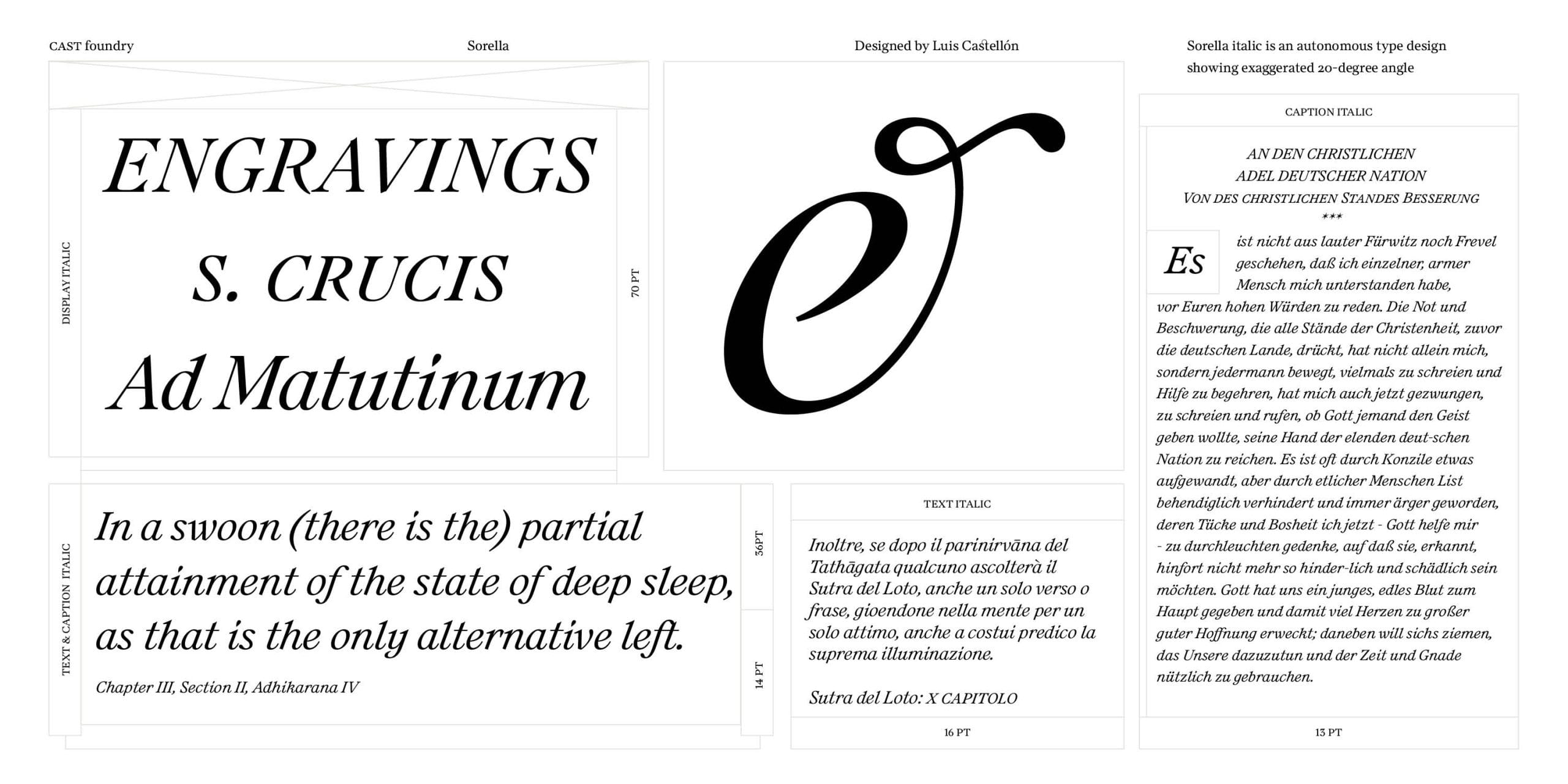 Sorella and Sorella Italic include small caps, four styles of numerals (proportional and tabular, lining and old-style), fractions, superior and inferior numbers, and all the elements of a typeface needed to handle complex typography. As with all respectable families featuring optical sizing, the Display size has a higher thick/thin contrast and narrower general proportions compared to Text and Caption.