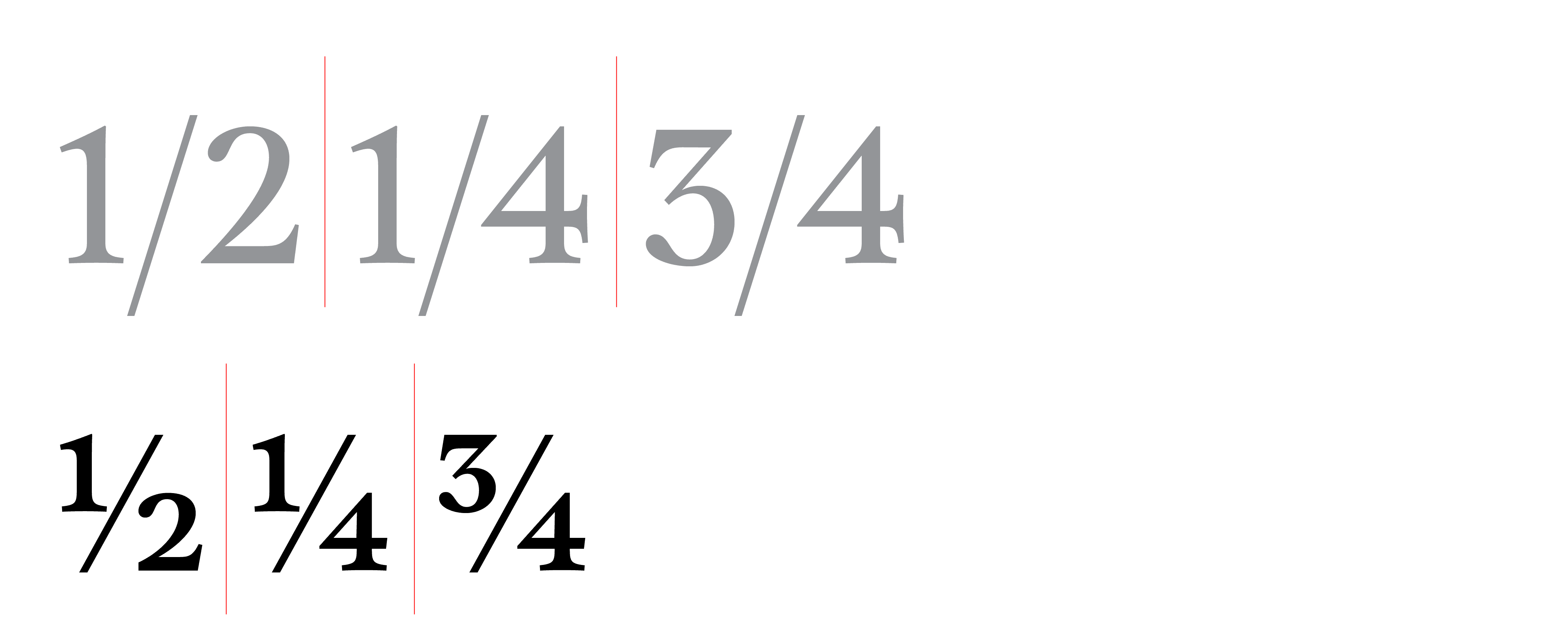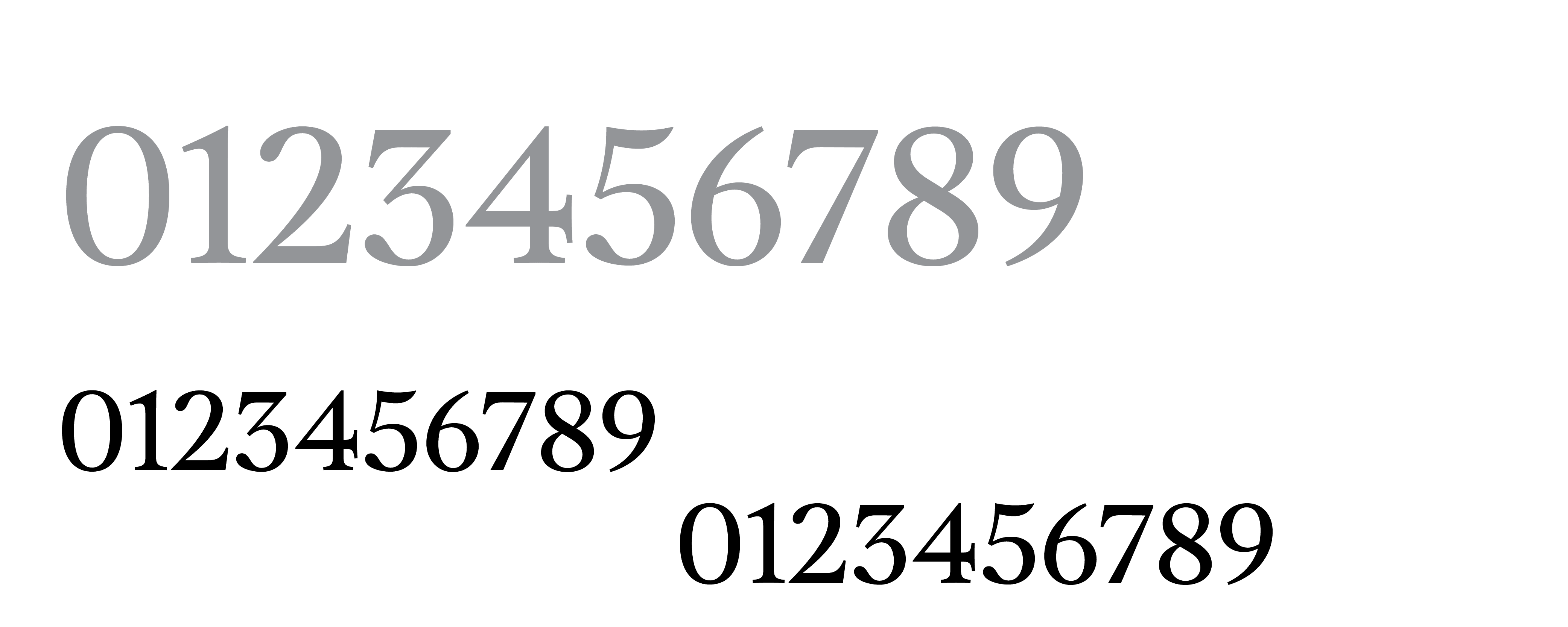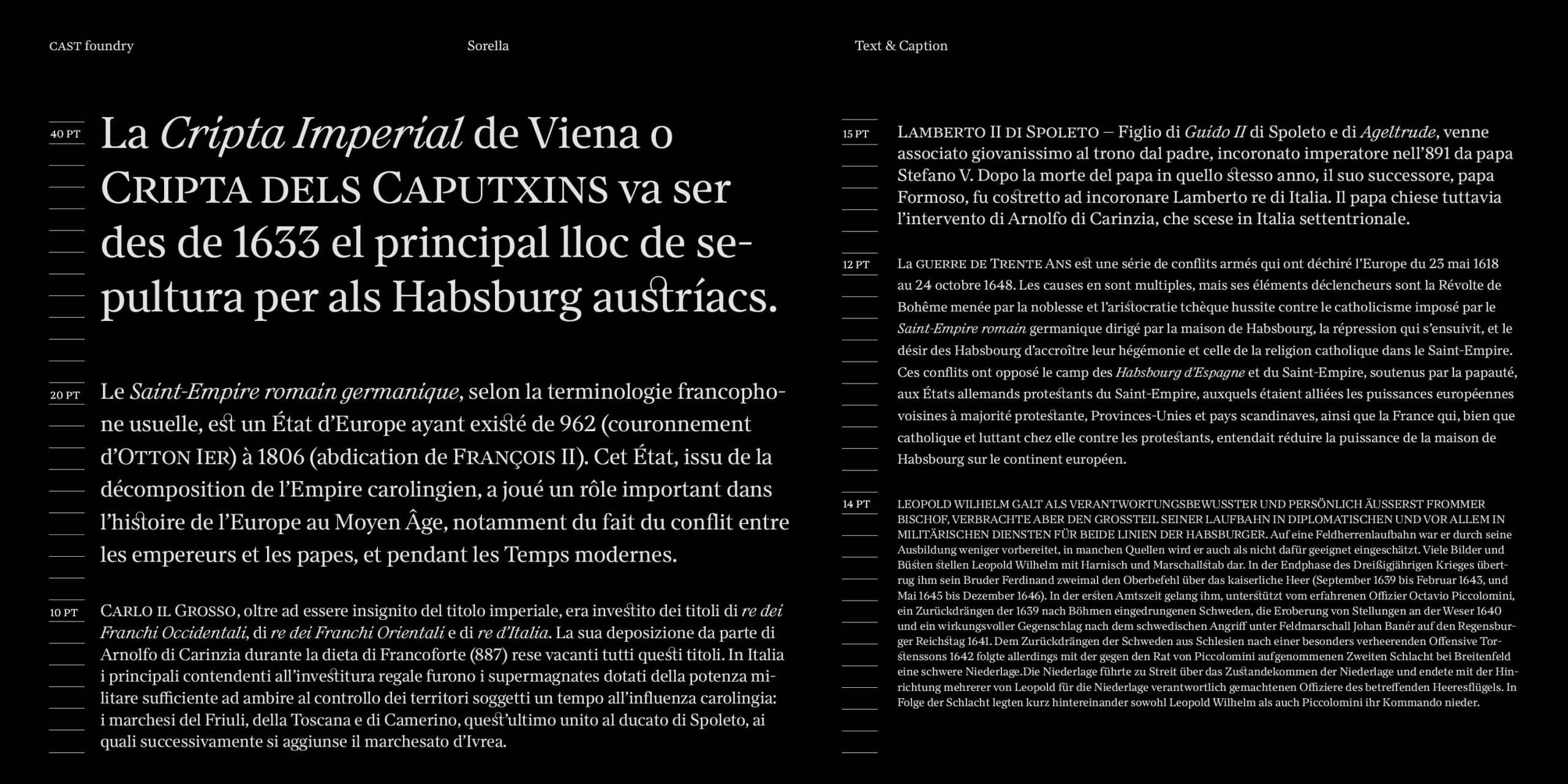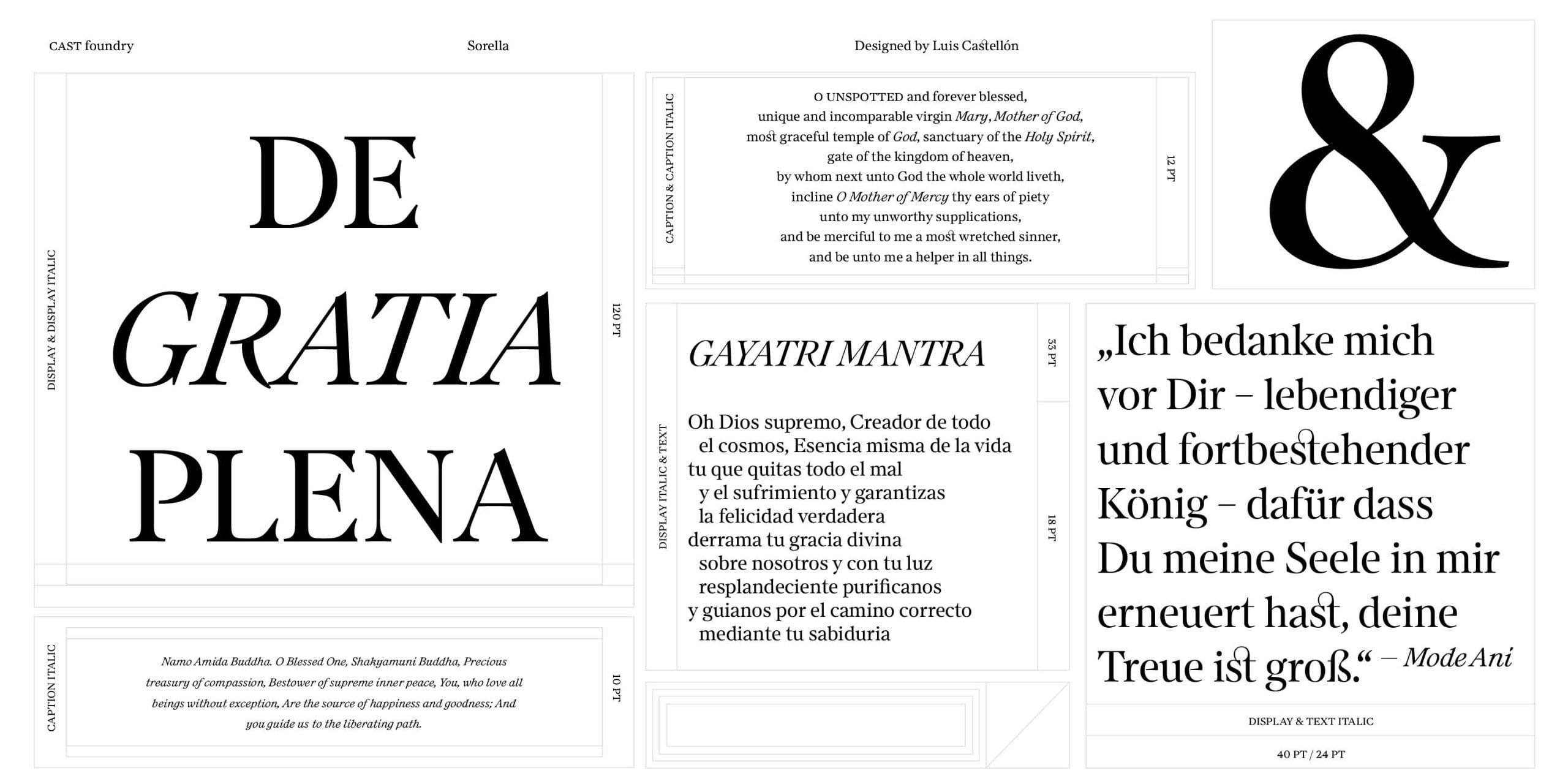 Sorella and Sorella Italic include small caps, four styles of numerals (proportional and tabular, lining and old-style), fractions, superior and inferior numbers, and all the elements of a typeface needed to handle complex typography. As with all respectable families featuring optical sizing, the Display size has a higher thick/thin contrast and narrower general proportions compared to Text and Caption.
