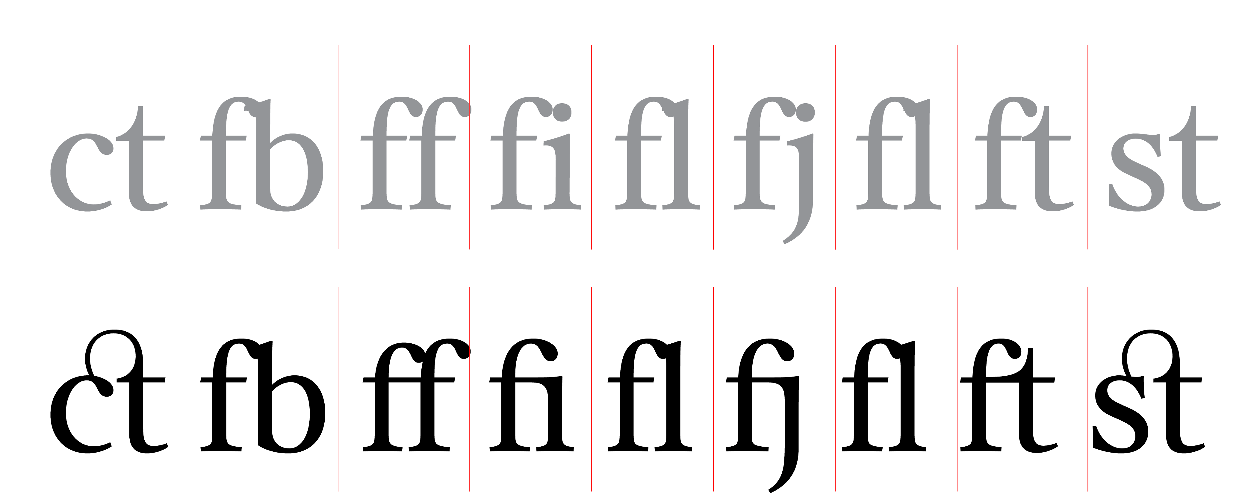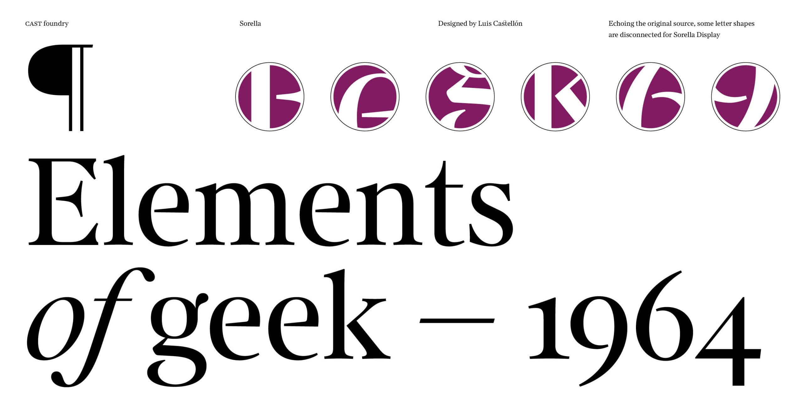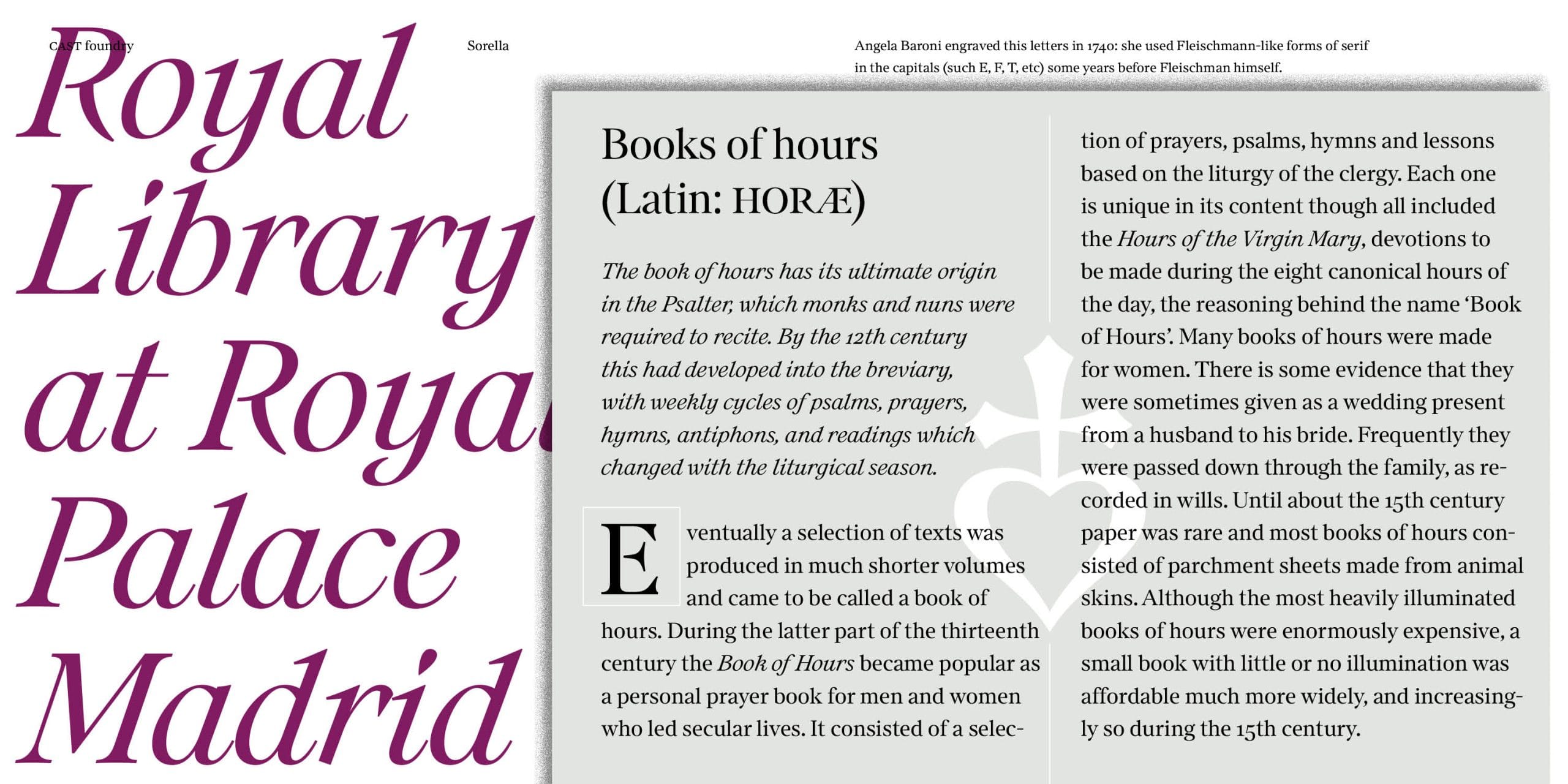 Its soft and slightly compact letters are carefully crafted and together with the sharp serifs and the bulbous terminals evoke an 18th-century atmosphere – a perception enhanced by some mannerist touches that reveal its engraved calligraphic origins, such as the unconnected parts of E, F, e and g. Other unconnected strokes are scattered throughout the alphabet and P, B and R also have open counters which contribute to a notable feeling of openness and lightness.